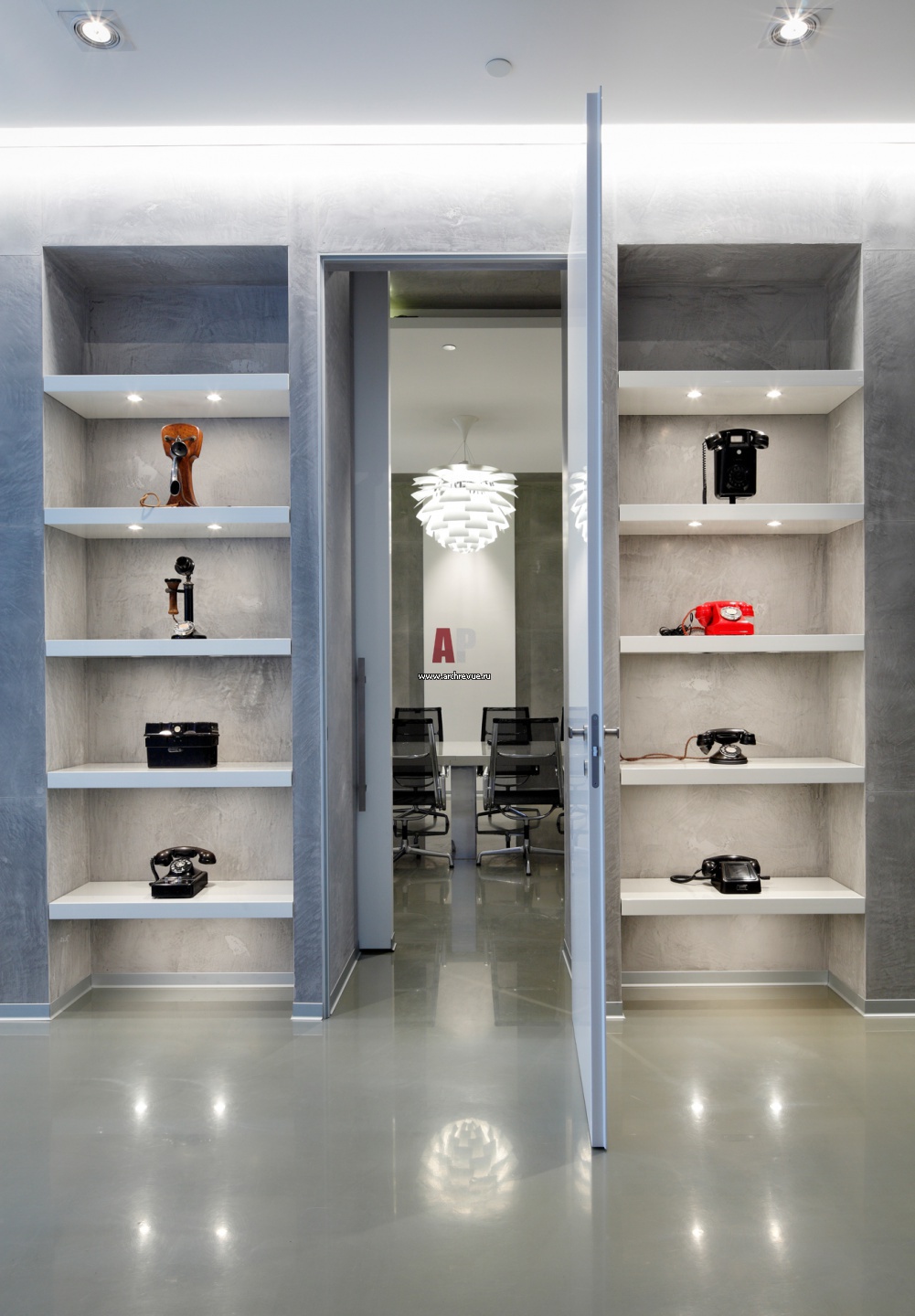 Вид из коридора на зал переговоров. Вход обрамляют ниши, в которых расставлены старинные телефонные аппараты.