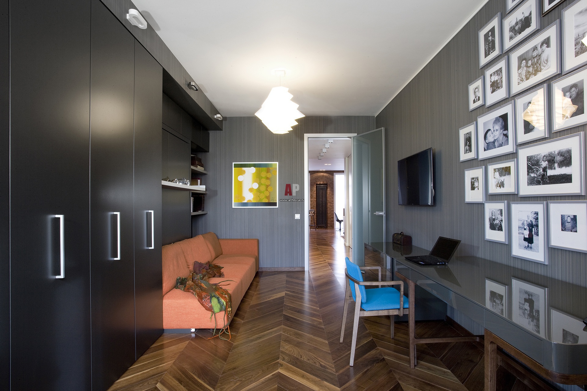 Кабинет легко превращается в гостевую комнату благодаря кровати, которая спрятана в шкафу. На фоне обоев цвета асфальта и мебели из темного венге ярко выглядит оранжевый диван и полотно «Одуванчики» художницы Зинаиды Буравовой. Панно из фотографий семейного альбома над письменным столом выполнено на заказ.