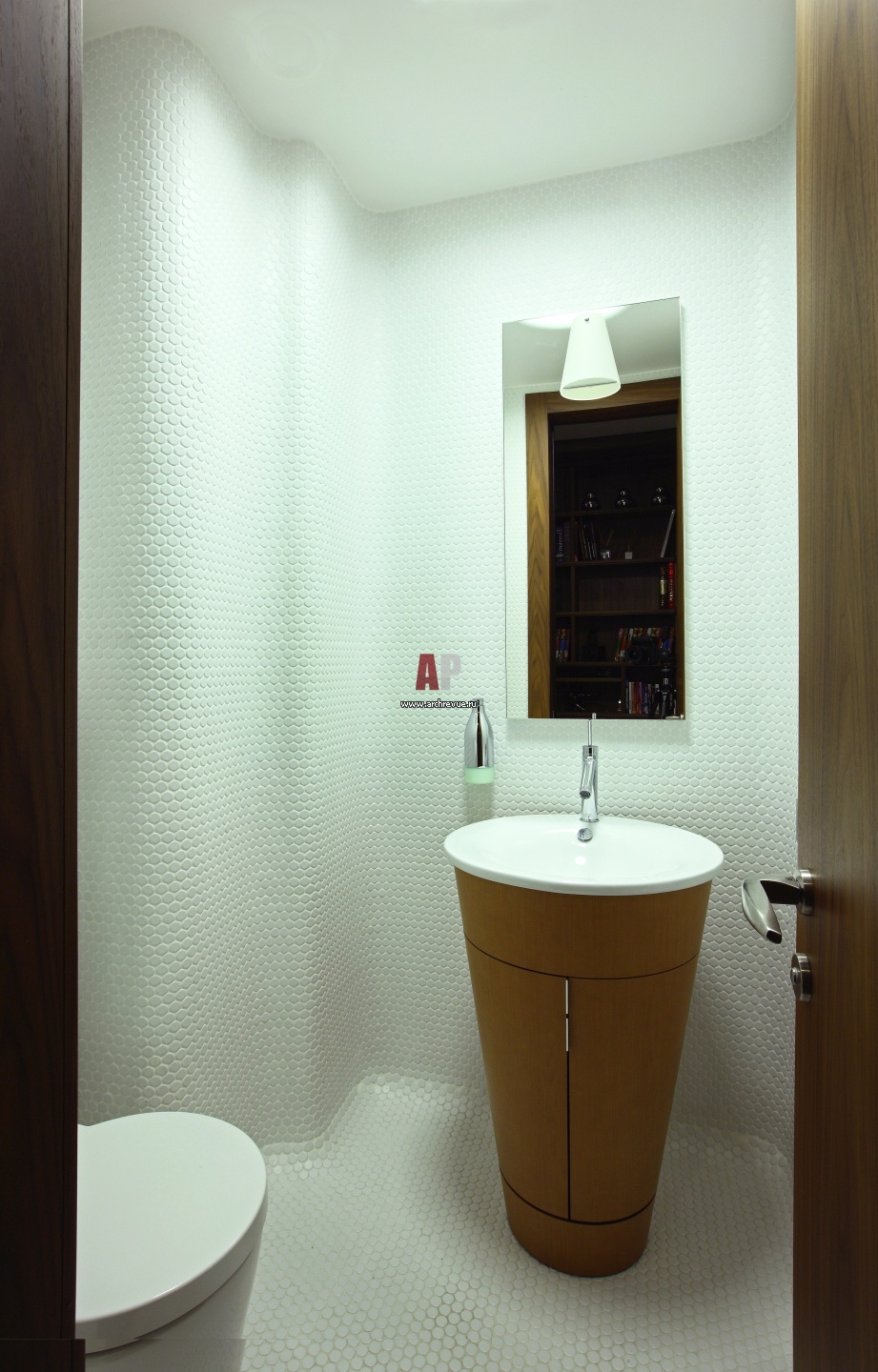 Гостевой санузел. Стен обтекаемой формы и пол выложены белой мозаикой. Умывальник, Duravit, дизайнер Филипп Старк.