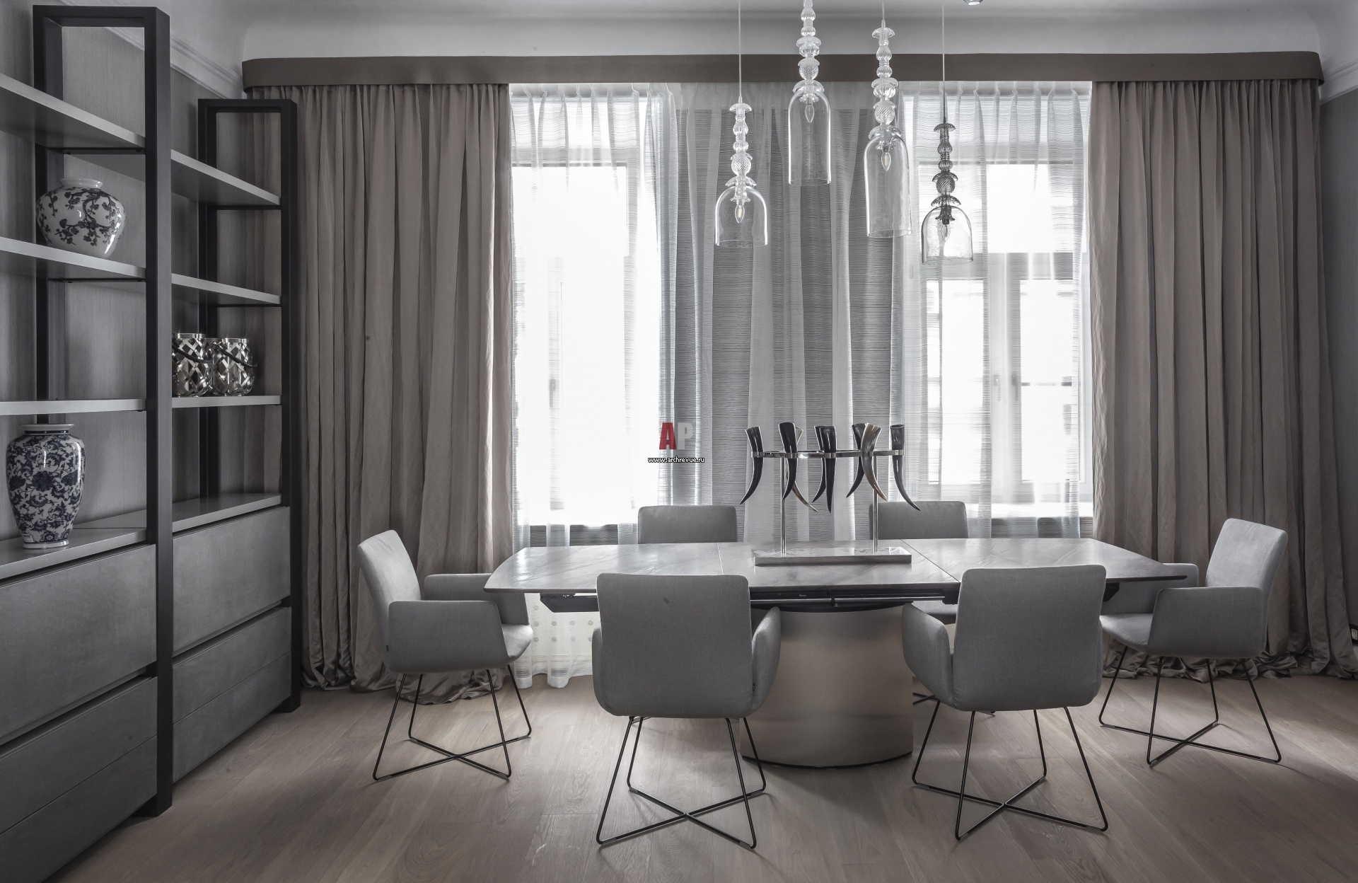 Интерьер квартиры решен в благородных серых шоколадных тонах. Обеденный стол с каменной столешницей, Draenert. Стулья, COR.