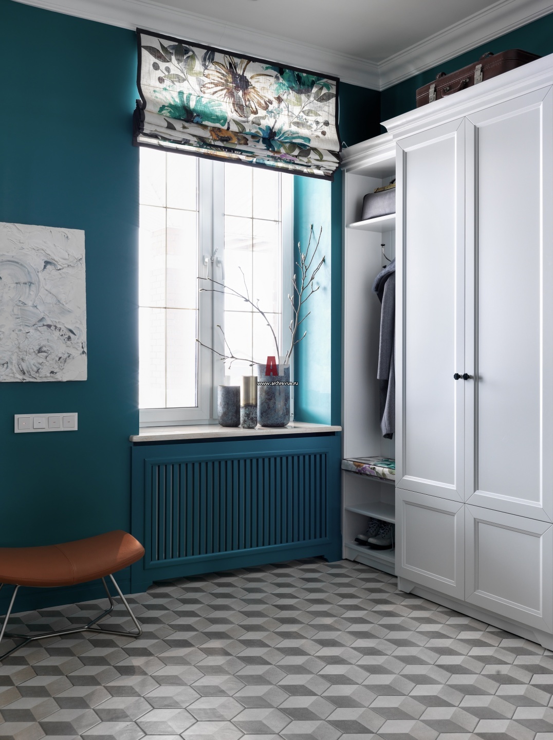 Входная зона с изумрудными стенами. На полу – плитка, CE.SI. Мебель сделана на заказ по эскизам дизайнера. Банкетка, BoConcept. Шторы, ткань, Chivasso.