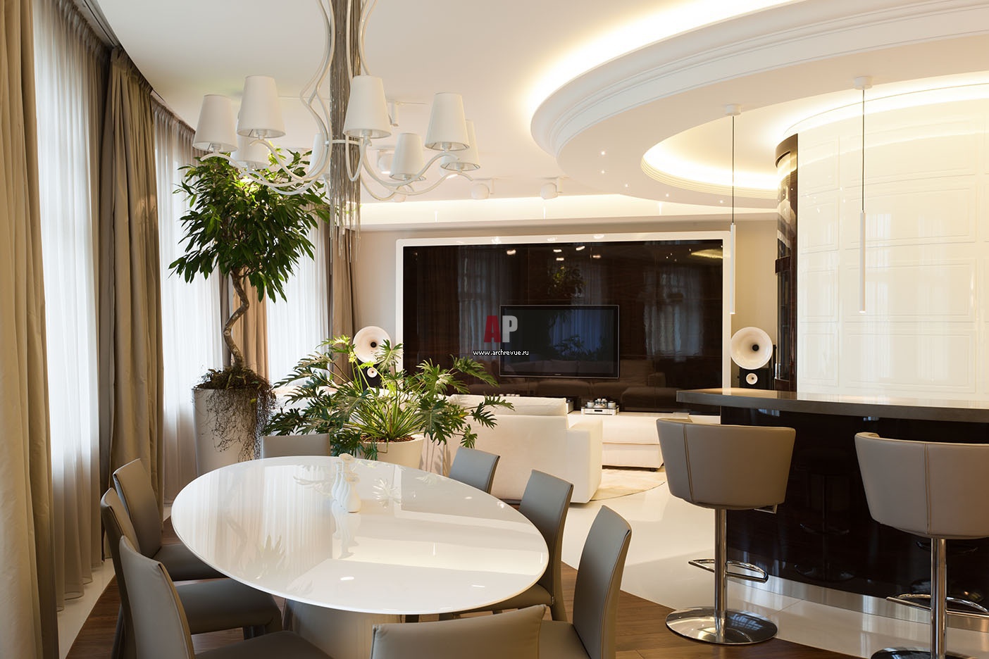 В интерьере столовой современные формы смиксованы с традиционным дизайном. Обеденный стол, Emmemobili. Стулья, B&B Italia. Зона отдыха представляет собой полноценный домашний кинотеатр с огромным экраном и профессиональной аудиосистемой.