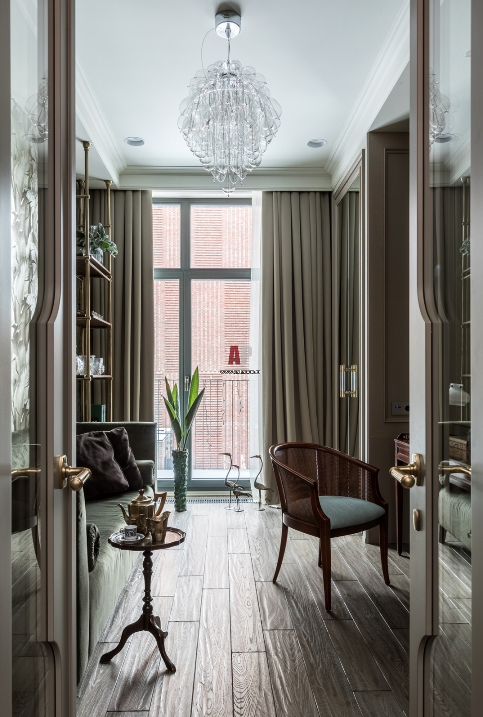 Распашные двери, диван, стеллажи, встроенная мебель сделаны на заказ. Кресло, стол, придиванный столик - винтаж. Диван, Falke mebel. Технический свет, Delta Light.