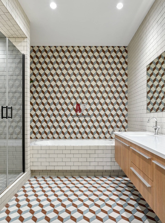 Стены и пол основного санузла облицованы плиткой TopCer с 3D- эффектом. Фоновую плитку дополняет белая плитка-кабанчик на бортике ванны и на стене за умывальником.
