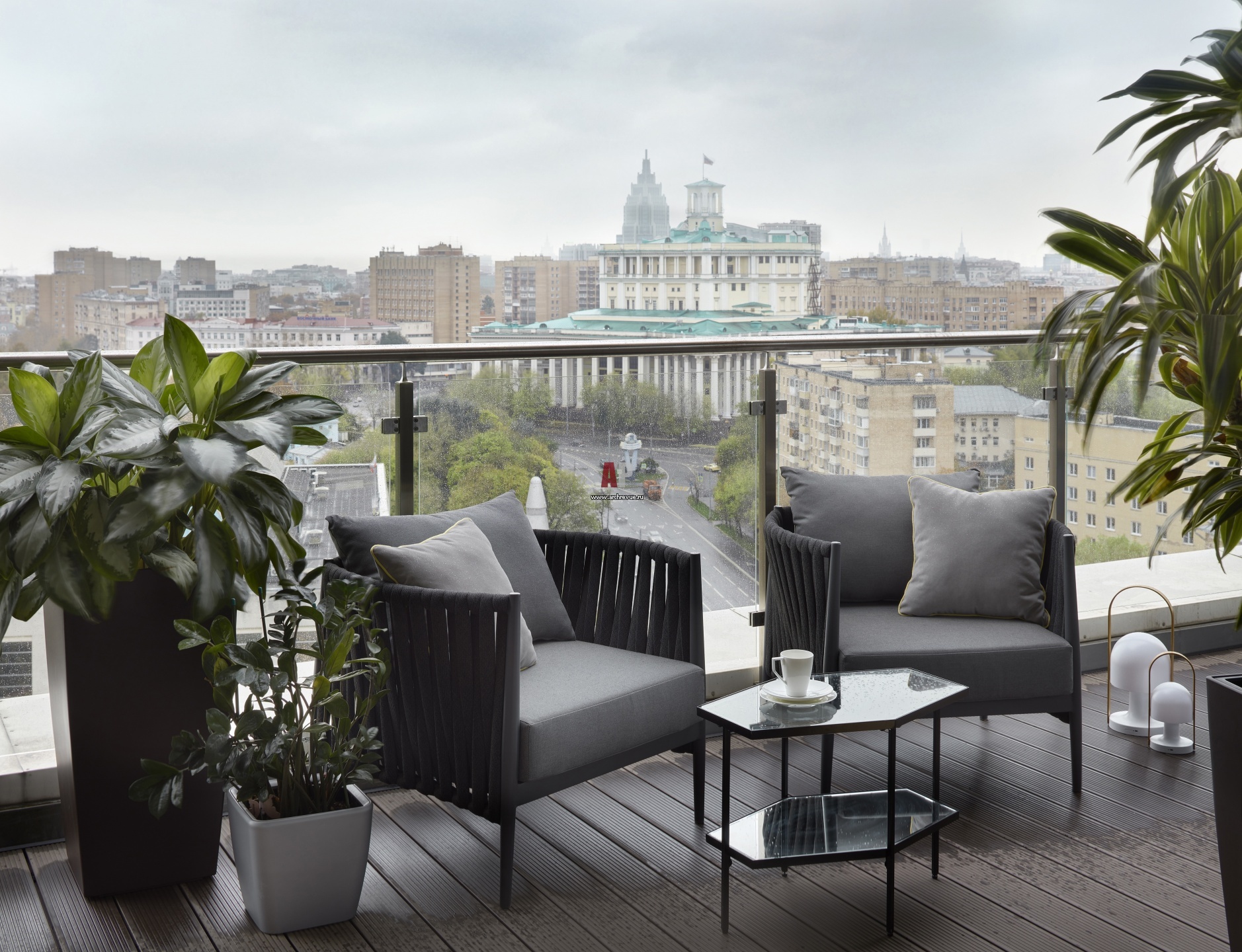 Огромное преимущество этой квартиры – 50-ти метровая видовая терраса, с которой открывается прекрасный обзор на 180 градусов в том числе и на Театр Российской армии. Мебель, Altezza Outdoor.