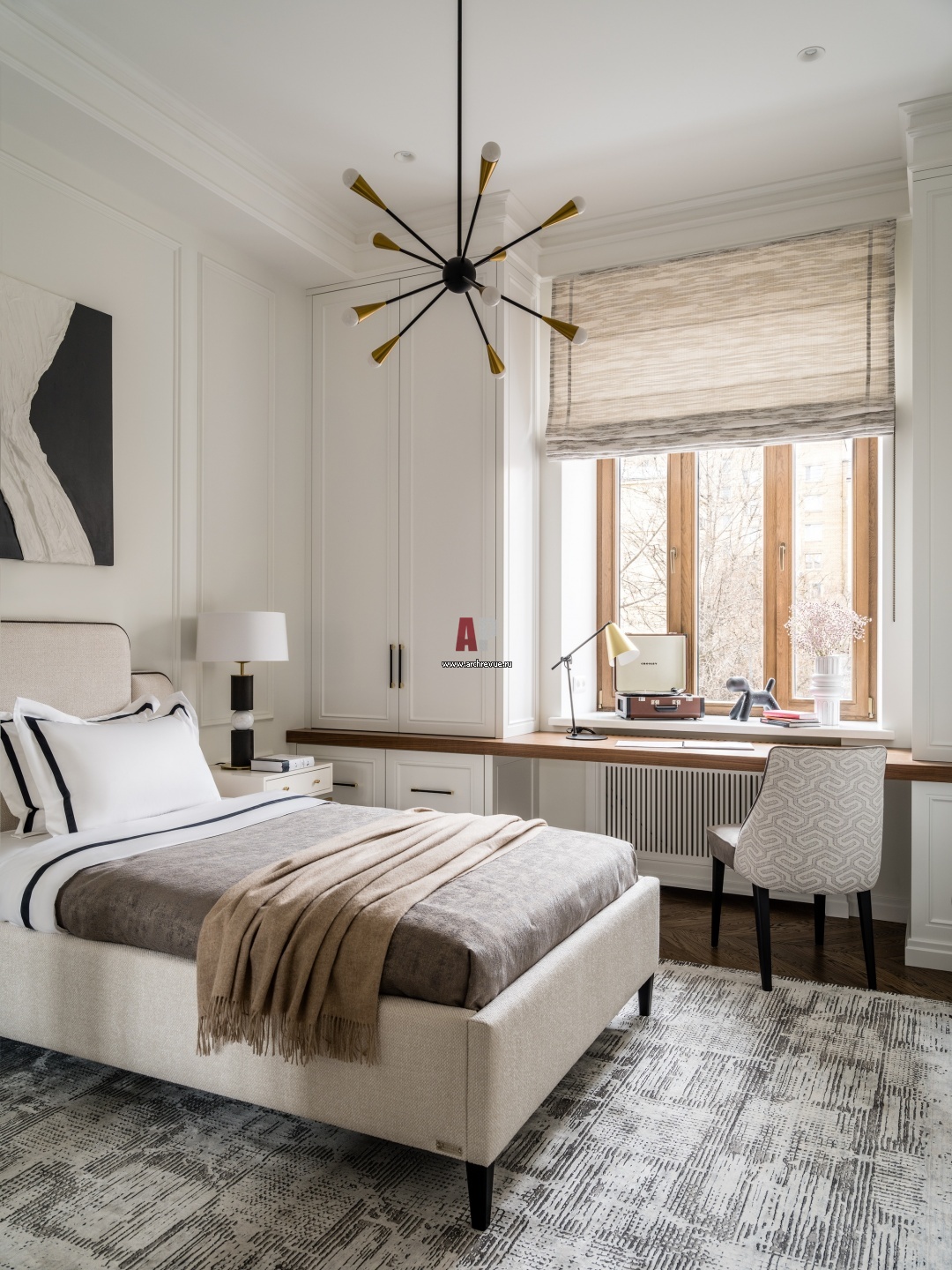 Детская комната одной из дочерей получилась почти монохромной. Стены оформлены гипсовыми молдингами. Мебель, Rooma Design & Furniture, Manifesto.