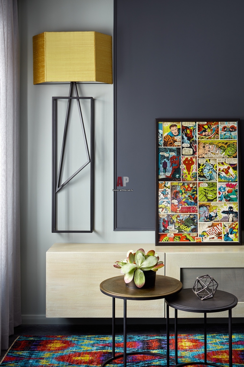 Светильники и бра с черными металлическими основаниями выполнены на заказ. Крупные, с жесткой геометрией, они масштабируют пространство.
