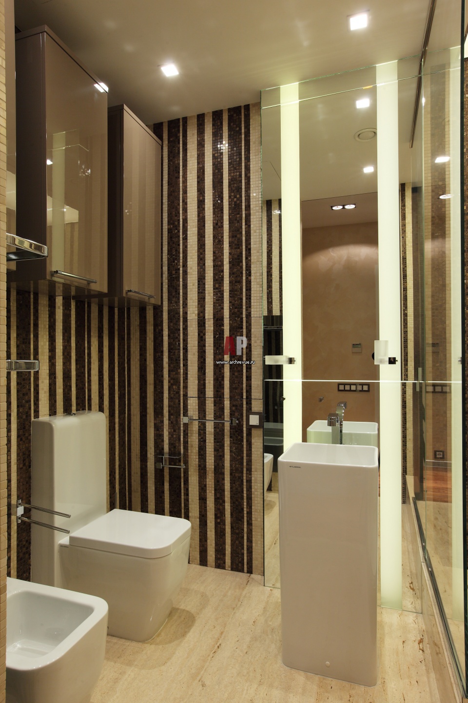 Санузел в отделке из мозаики. Сантехника со строгой геометрией, Flaminia.