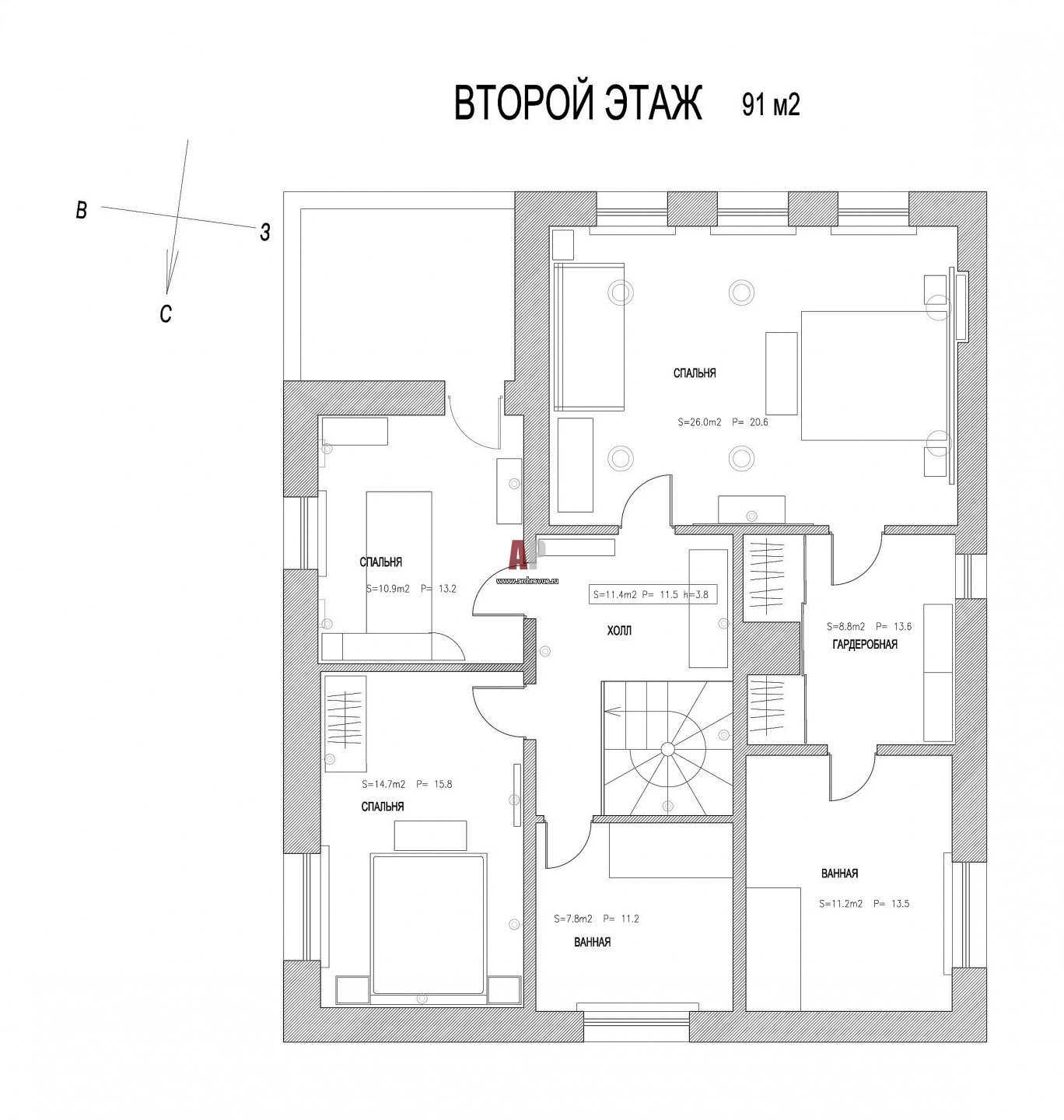 Планировка 2 этажа 2-х этажного дома площадью 224 кв. м.