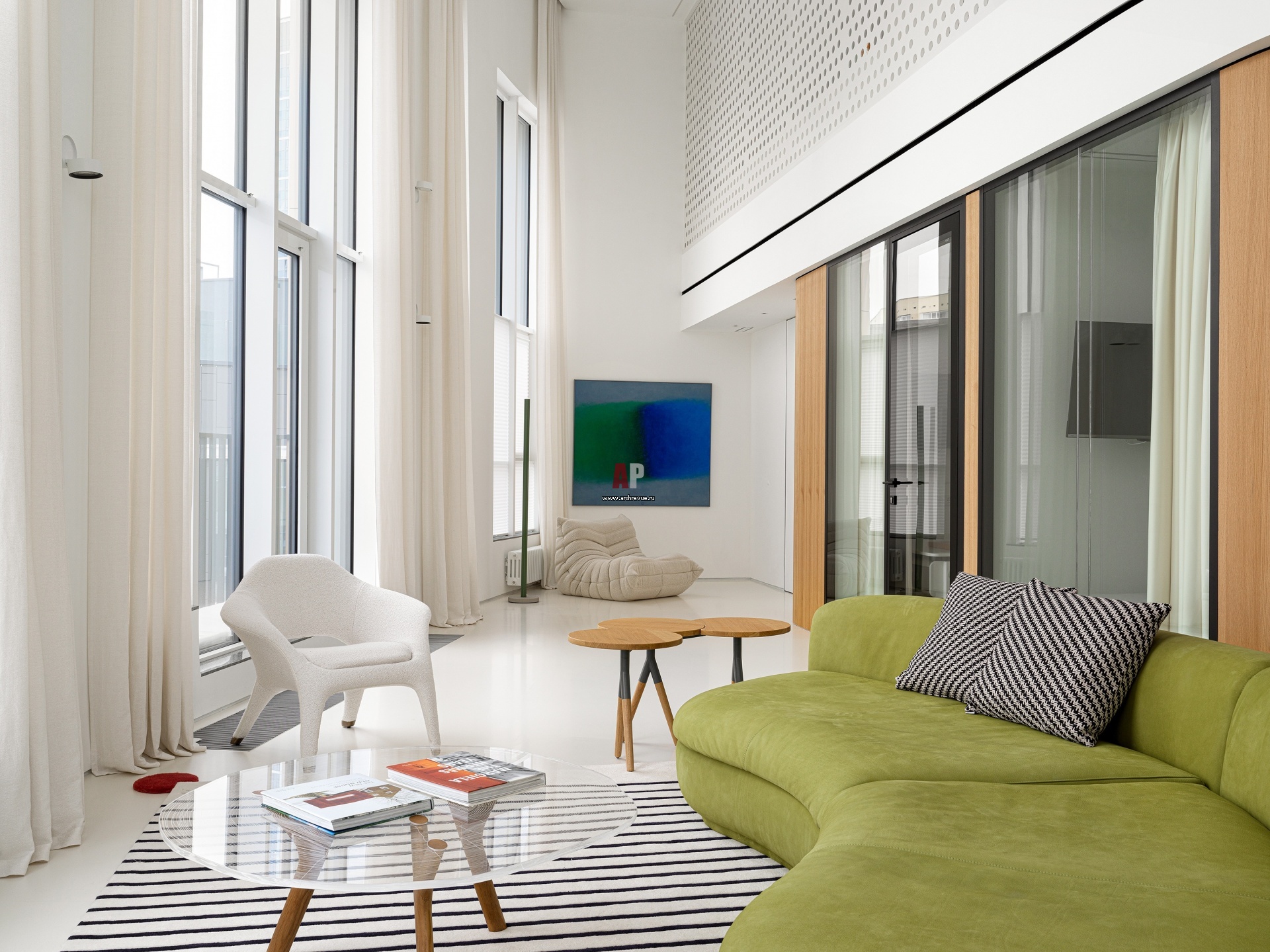 Гостиная. Ограждение второго этажа выполнено из перфорированных панелей. Они обеспечивают приватность и вместе с тем пропускают естественный свет.