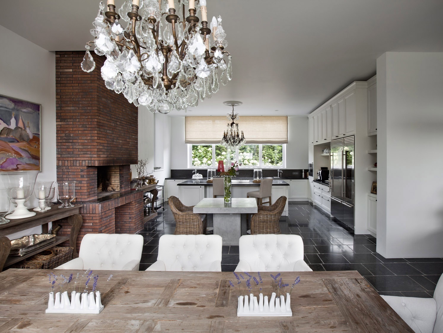 Центральное помещение первого этажа – просторная кухня-столовая. Из столовой есть выход в сад. Кухня, Castagna Cucine. Мебель, люстры, Flamant.