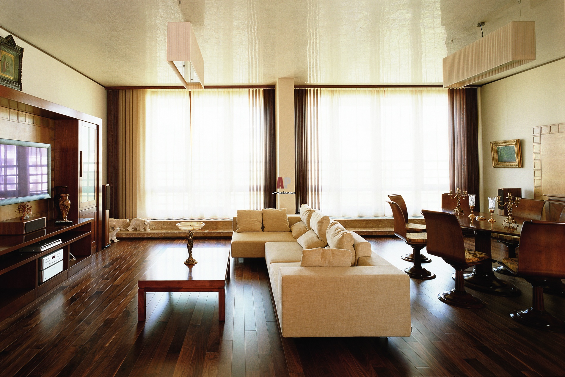 Радиаторы отопления, расположенные под панорамными окнами, скрыты за декоративными панелями из мрамора. Они играют роль подоконников и полок для мелкой пластики.