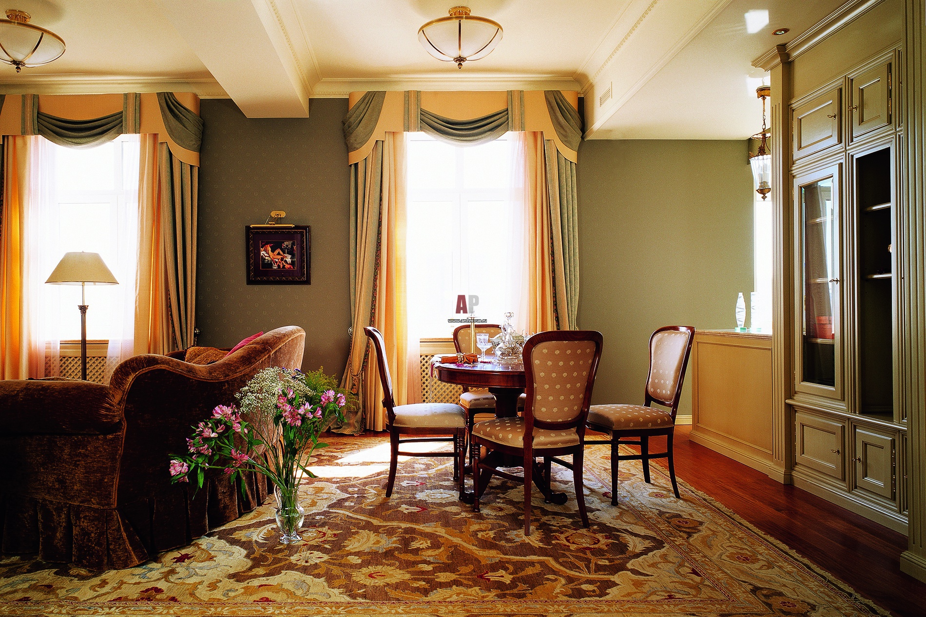 Столовая включена в общее пространство с гостиной. Разные зоны выделены потолочными уровнями. Два окна вдоль одной стены – характерная особенность московских купеческих интерьеров.