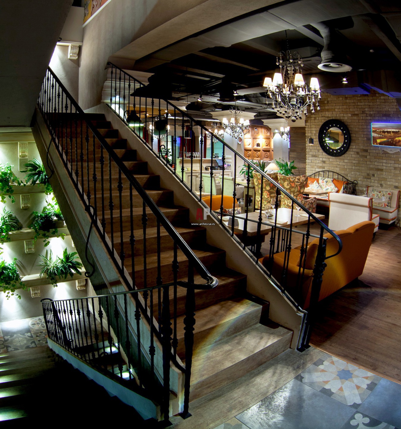 На фото – оформление лестничного холла ресторана. Ступени облицованы керамогранитом с имитацией дерева (размер модуля 1,20 Х 30 см). Ограждение из черного кованого металла. Чтобы зрительно расширить лестничный холл, стены были зашиты старинной деревянной доской со вставками из зеркал.