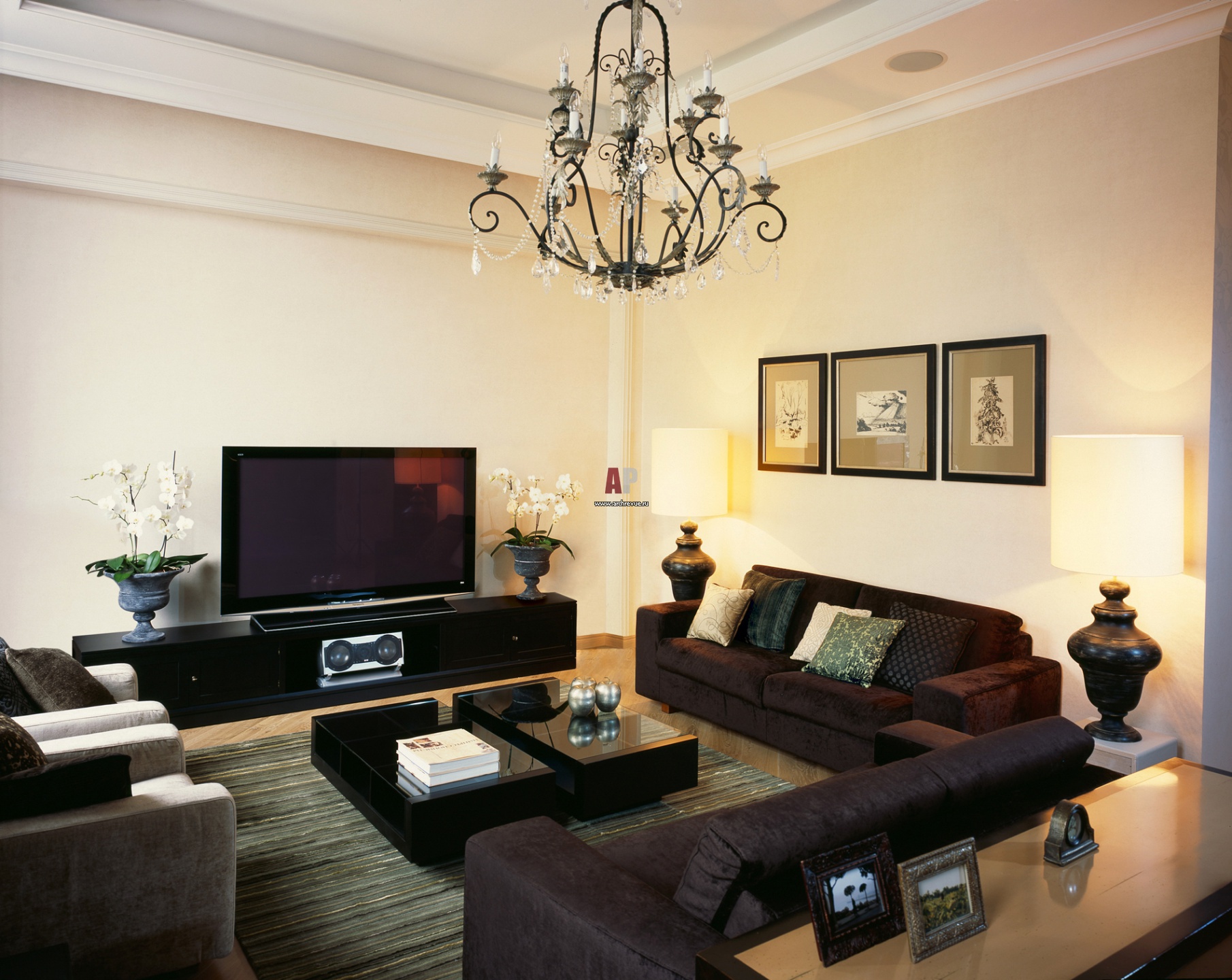 Фото зоны домашнего кинотеатра в гостиной. Интерьер выполнен в спокойной черно-белой цветовой гамме. Яркие акценты – текстиль сложного зеленого цвета.