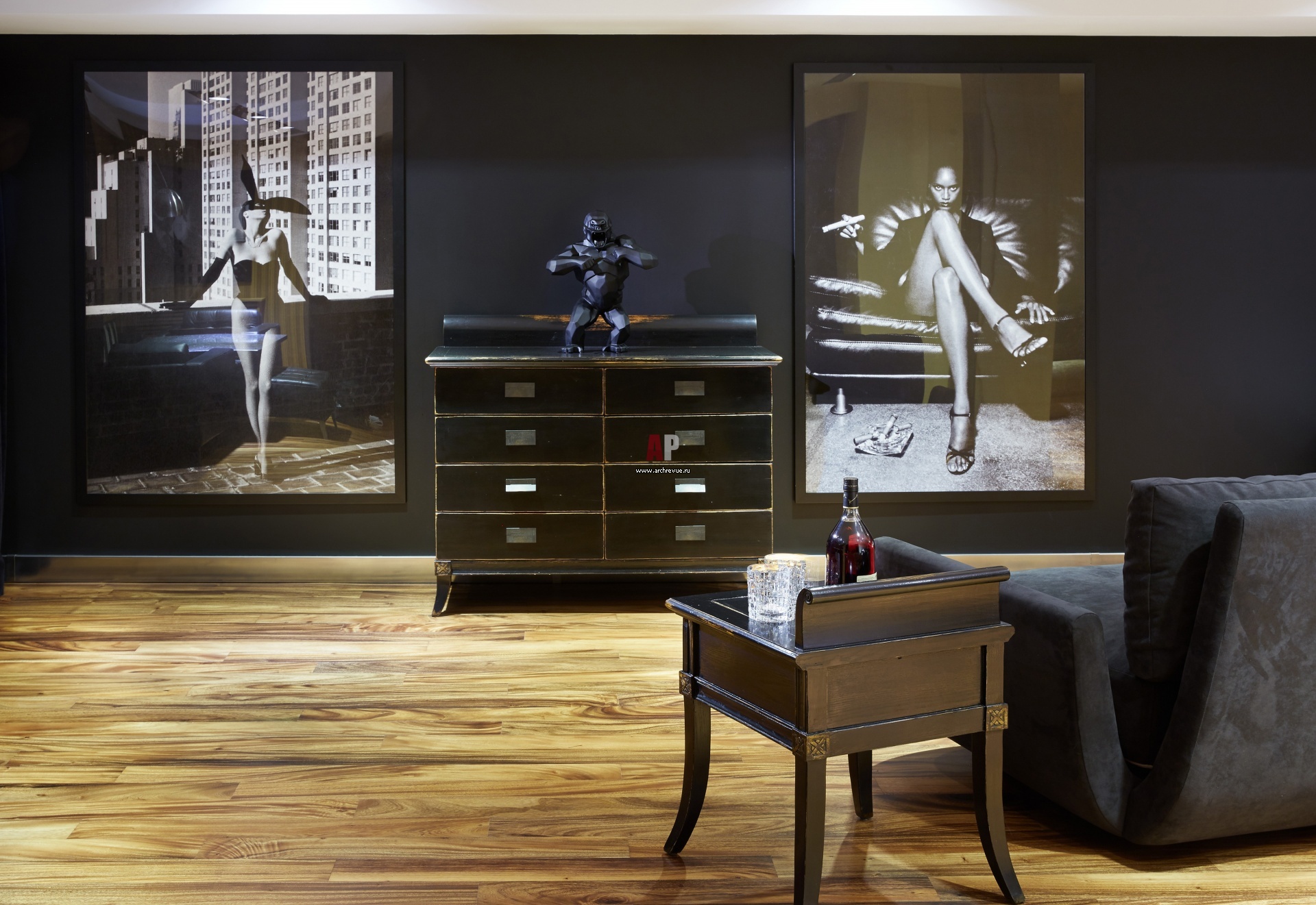 Зона отдыха в темных тонах оформлена черно-былыми фэшн-фотографиями работы Хельмута Ньютона.