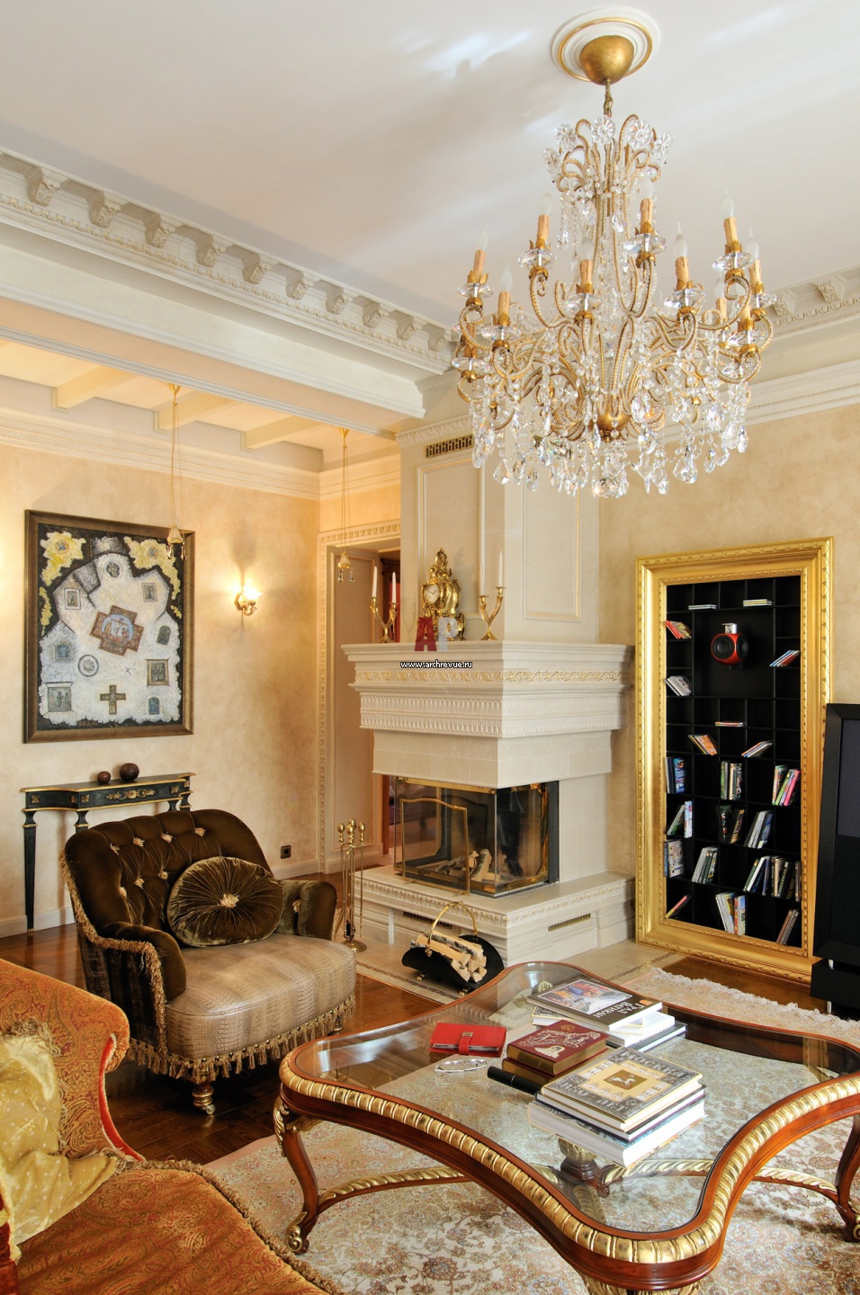 Фото каминной зоны. Как и потолочный карниз, топка камина оформлена рельефным декором из натурального прессованного мрамора.