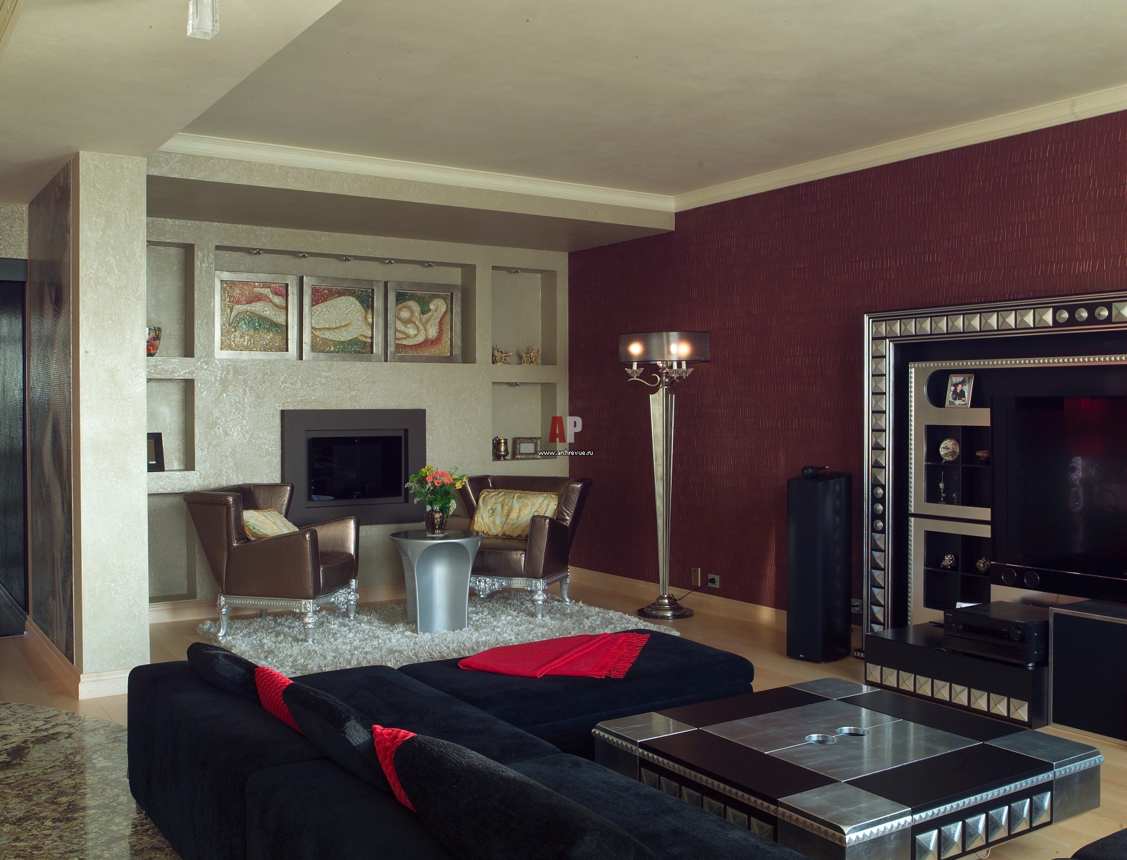Основной декоративный прием – структурные штукатурки. Многослойными покрасками с легким серебряным свечением оформлены не только стены, но и потолки. Работа с финишами, «Студия Марата Ка».