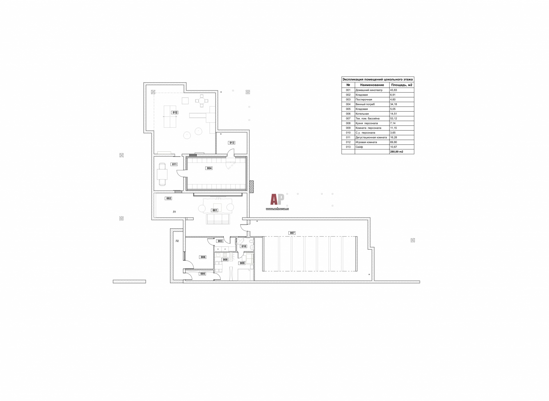 План цокольного этажа 3-х этажного дома 677 кв. м в стиле конструктивизм.