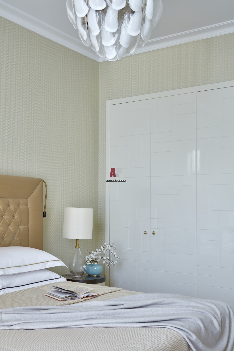Интерьер спальни. Встроенный шкаф с геометрическим рисунком, отделка – белая полированная эмаль, сделан на заказ. Прикроватная тумбочка, Longhi. Настольная лампа, Porta Romana.