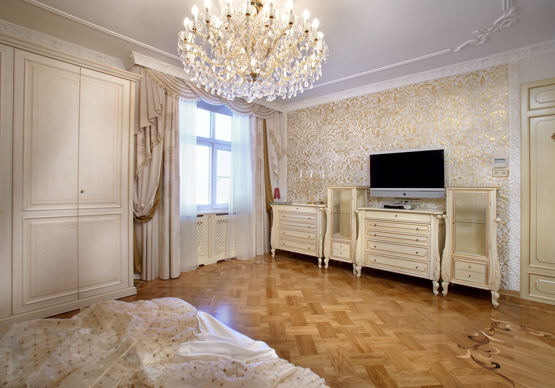 Спальня в классике. Лепной декор с позолотой: карнизы, потолочные розетки.