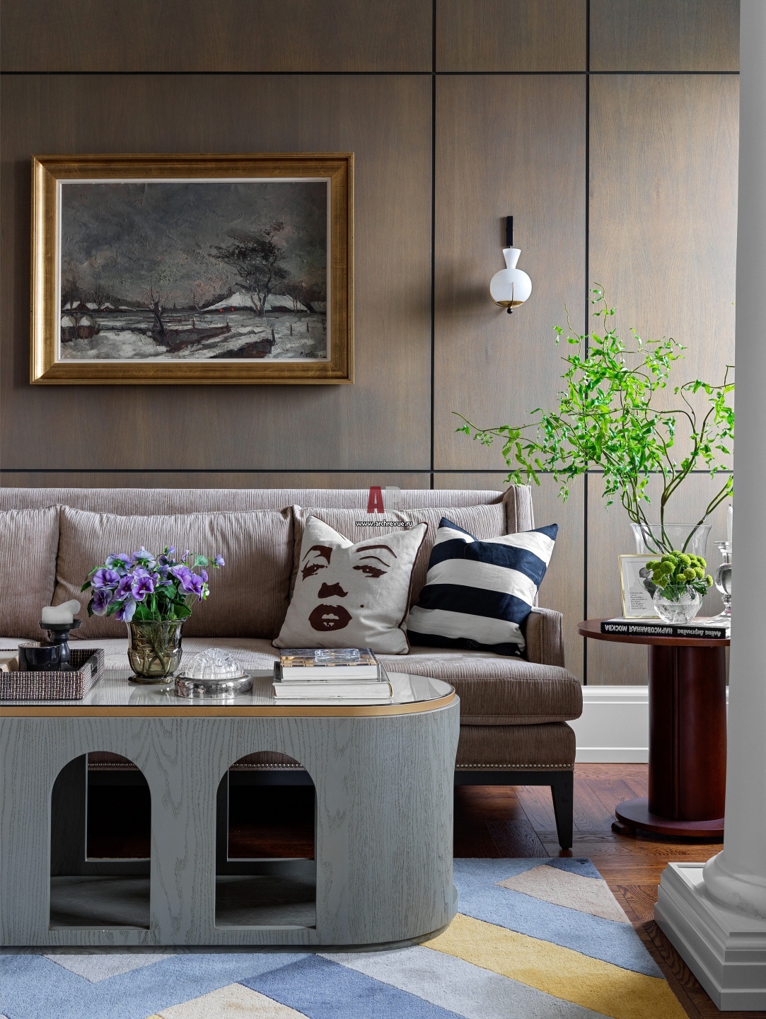 Журнальный столик сделан на заказ. Его облик рифмуется с архитектурой дома, который в народе известен как дом с тремя арками.
