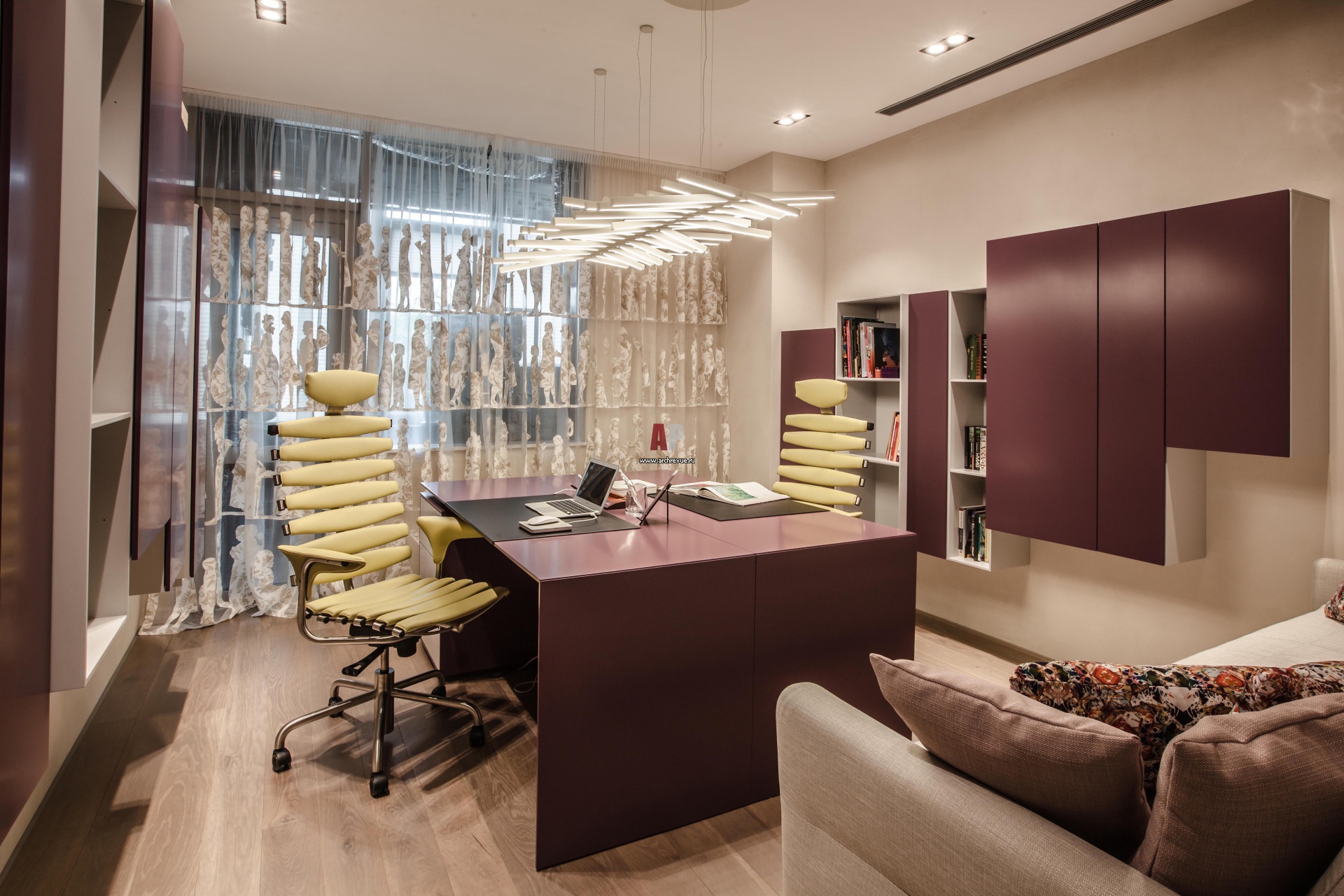 Интерьер кабинета решен в авангардной стилистке. С дизайнерской мебелью и светильником рифмуются шторы с изображением человеческих фигур в бальных платьях и париках.