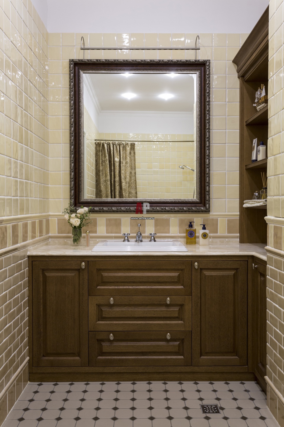 Интерьер ванной комнаты. Умывальник выполнен из дуба, как его продолжение выглядит встроенный в нишу шкаф с открытыми полками. Столешница из светлого мрамора.