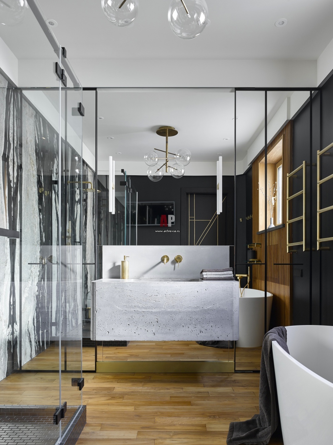 Эклектичная квартира на стыке лофта и эко-дизайна. Интерьер ванной комнаты. Раковина из бетона исполнена по эскизам автора проекта. Встроенные шкафы зеркальные шкафы по обе стороны от умывальника сделаны на заказ. Люстра, Gallotti & Radice.
