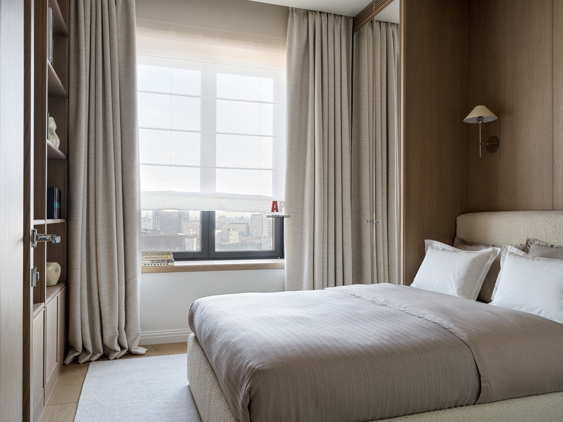 В женской спальне преобладают светлые оттенки и фактуры дерева.