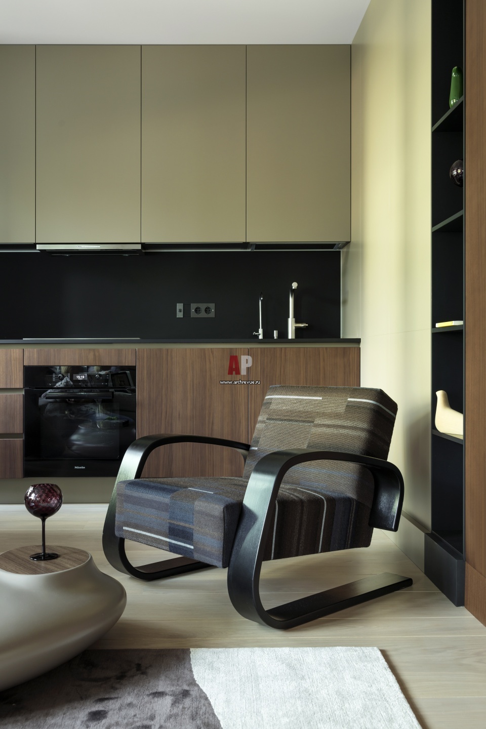 В оформлении пола использована разноформатная доска из массива дуба: от 15 до 40 см шириной. Кресло, Vitra.