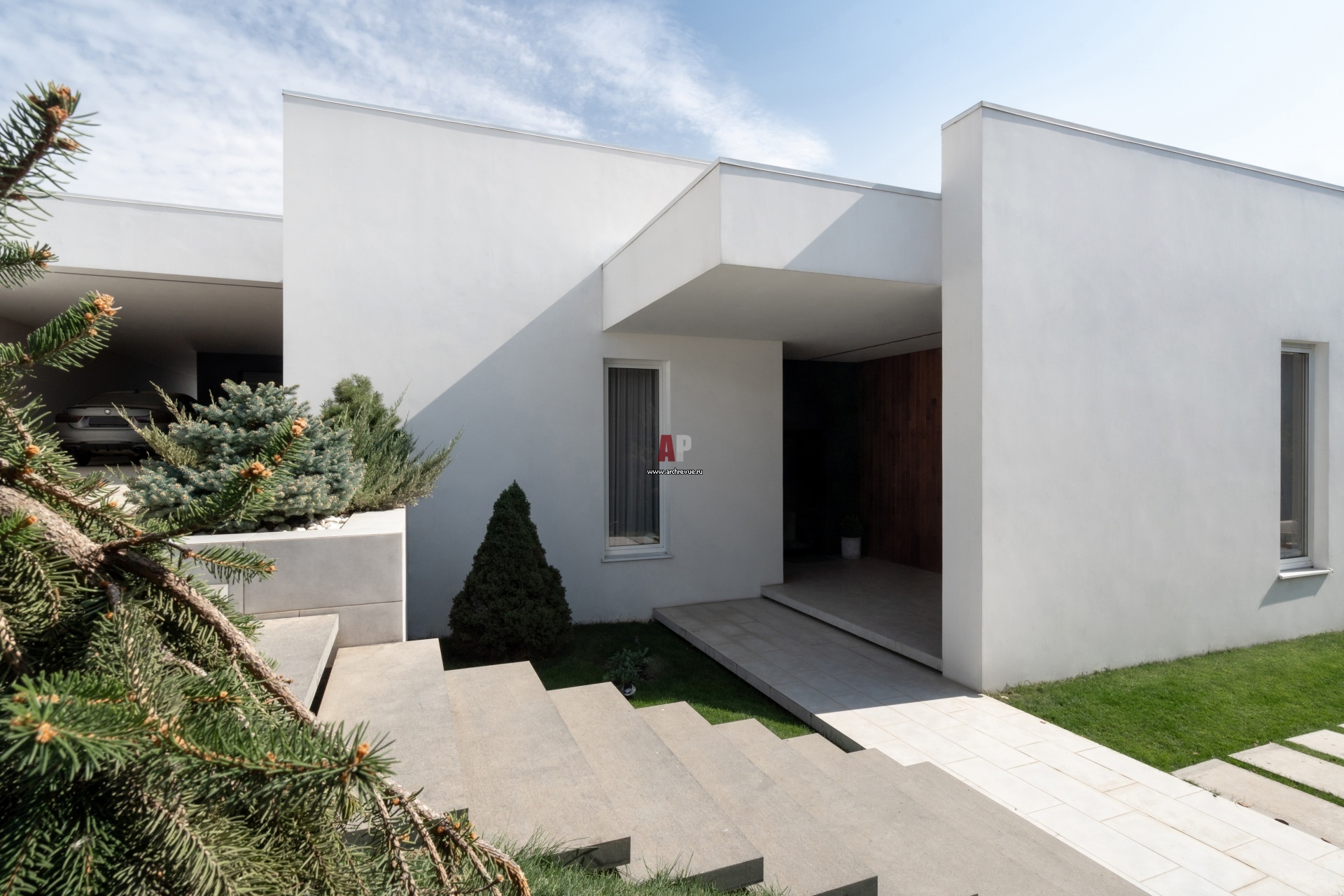 Одноэтажный дом Г-образной формы построен на ленточном фундаменте из керамических блоков и представляет собой композицию из простых белых объемов.
