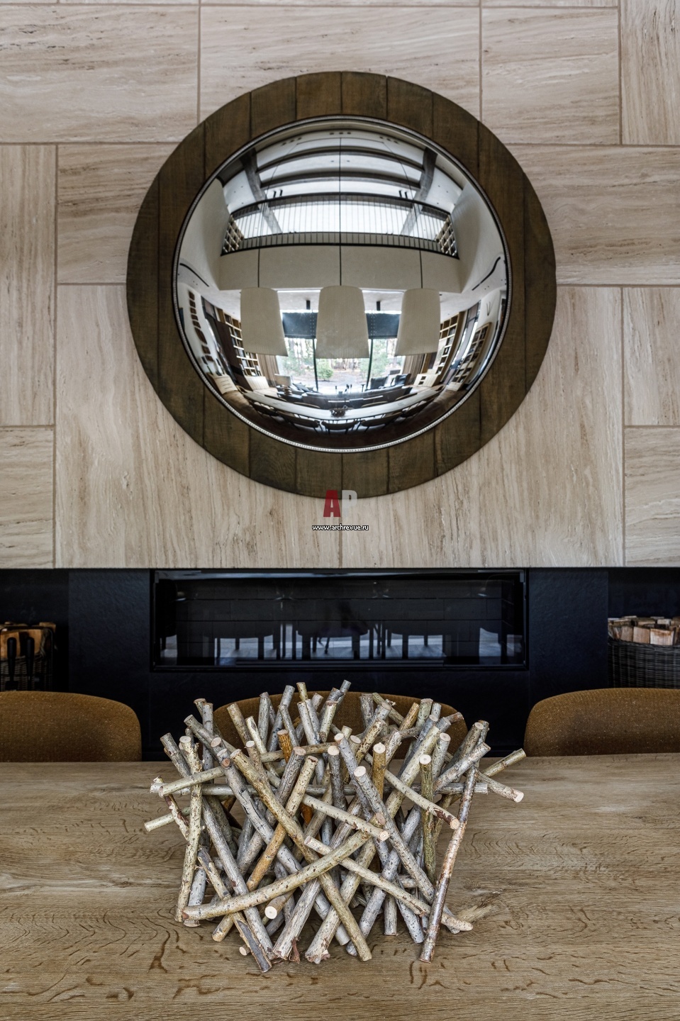 Камин оформлен зеркалом, подложка для которого создана по эскизам авторов проекта художником Денисом Миловановым.