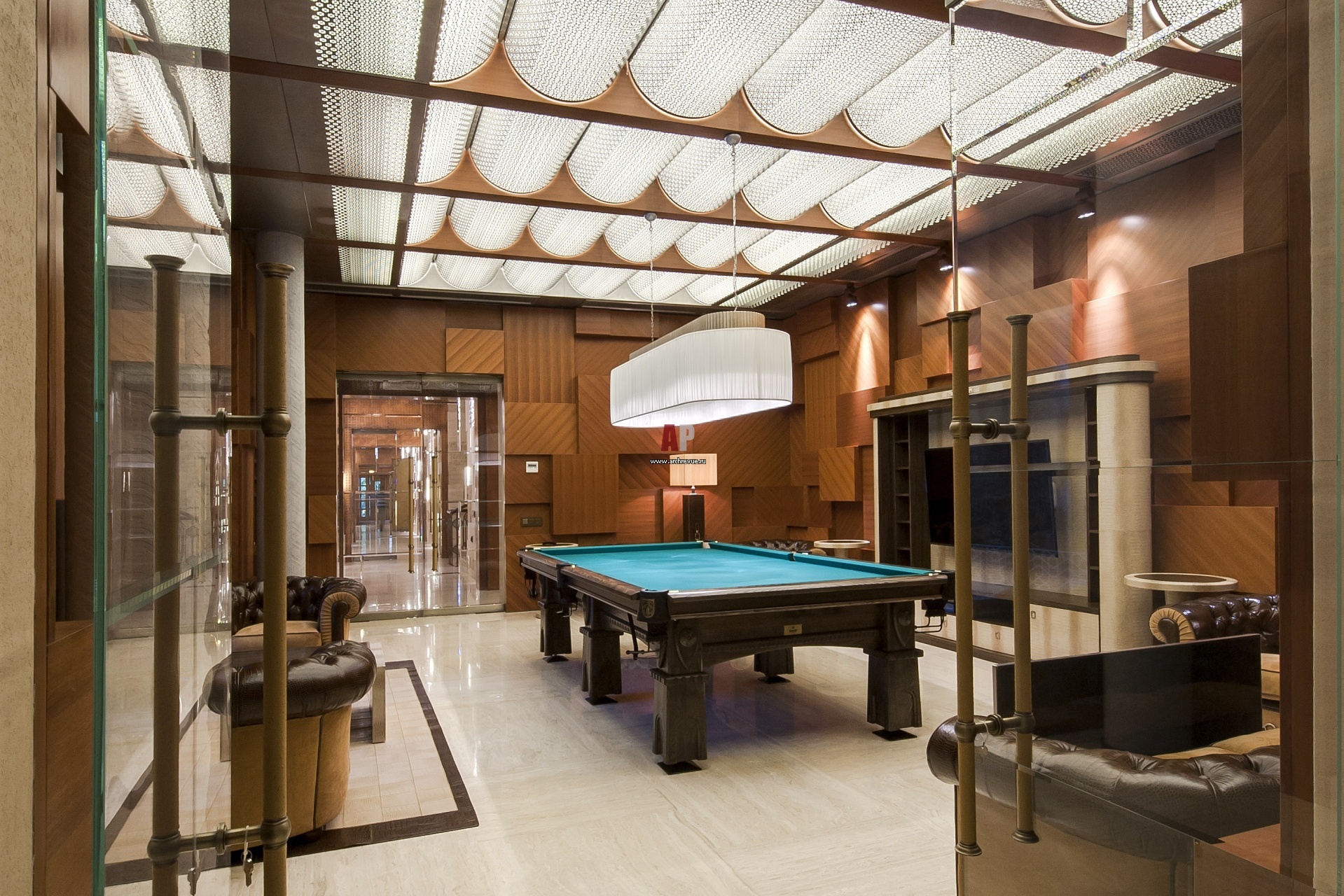 Стены в бильярдной облицованы панелями из красного дерева в форме кубов с разной шириной. На потолке – деревянные балки сочетаются с цилиндрами из перфорированного металла с подсветкой. Вместе они создают динамичный волнообразный рисунок... Встроенная мебель, изготовление «КингВуд».