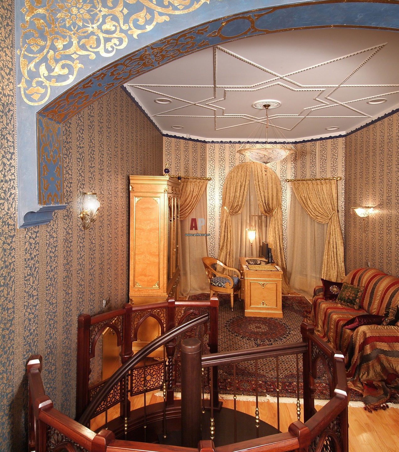 Кабинет расположен на третьем этаже дома. Он выполнен в восточном стиле и украшен арочной надстройкой, расписанной золотыми вензелями.