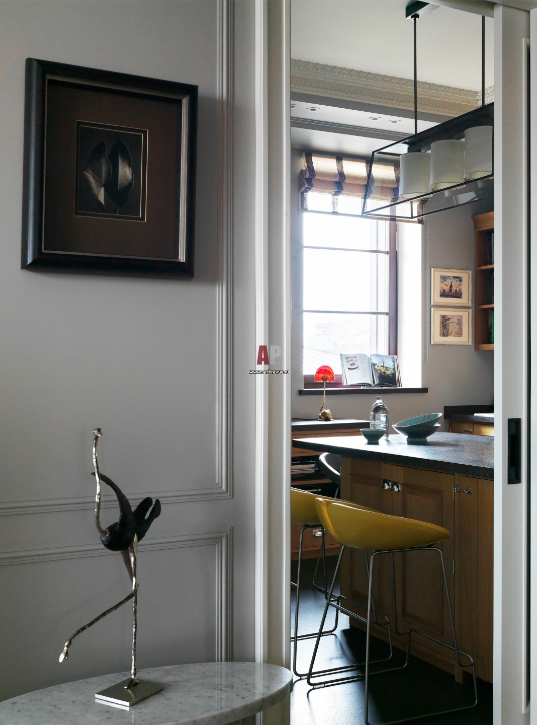 Кухня вынесена в изолированное помещение и оформлена раздвижной дверью с пескоструйным витражом. Кухонная мебель выполнена на заказ. На полу – вулканический камень. Стулья, Moroso.
