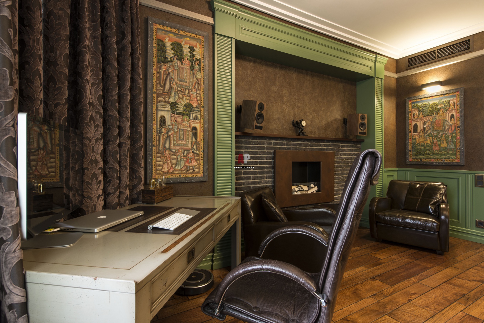 Зона камина в интерьере кабинета. Декоративный портал камина и декоративные панели из дерева оливкого-зеленого цвета. Топка из металла цвета состаренной меди.