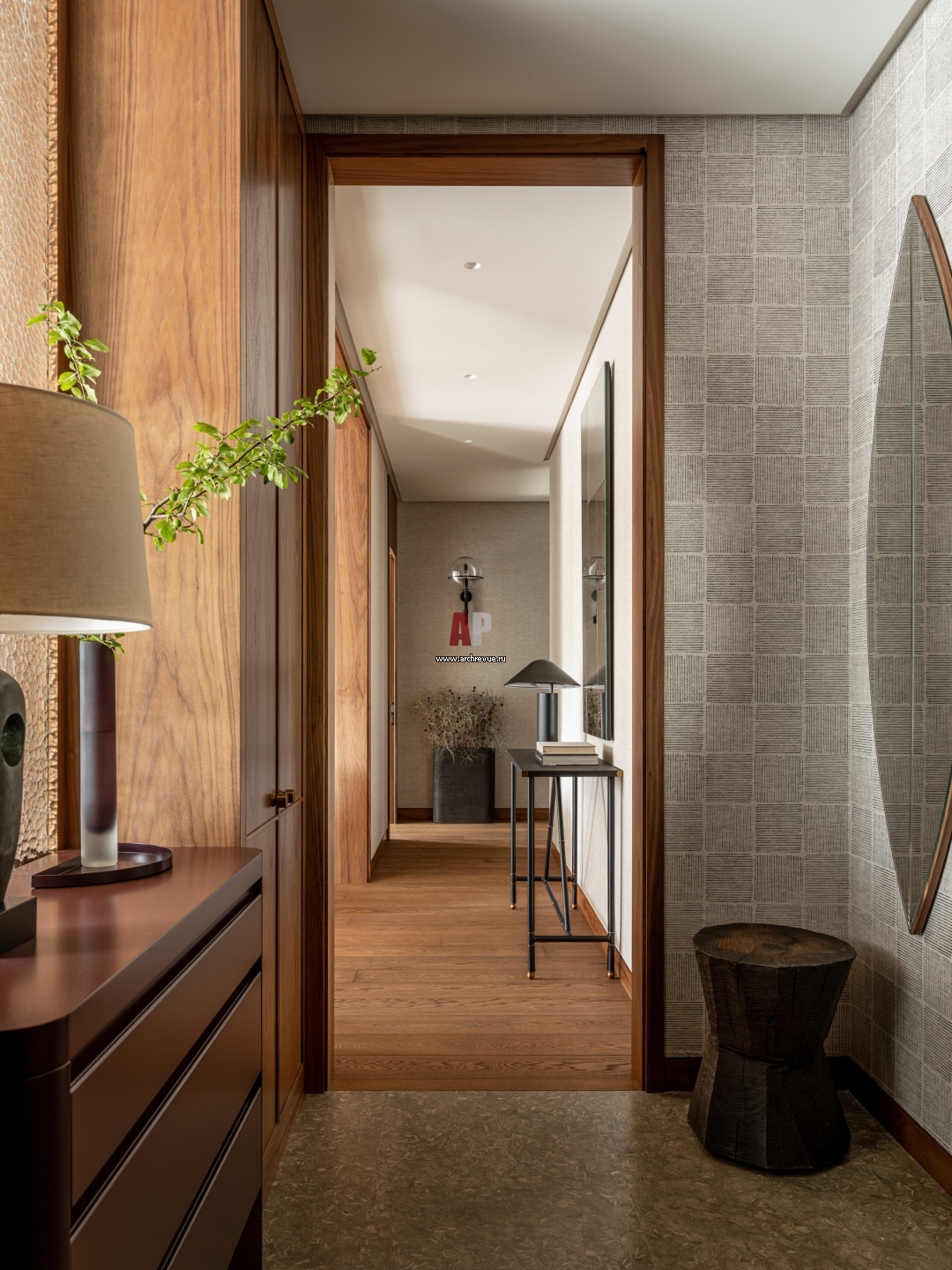 Входная группа с видом на приватный коридор. Столярные изделия выполнены по эскизам дизайнера. В проеме за тумбой слева – фактурное стекло. Зеркало, Porada. Табурет-пенек, Denis Milovanov. Настольная лампа, Seed Design.