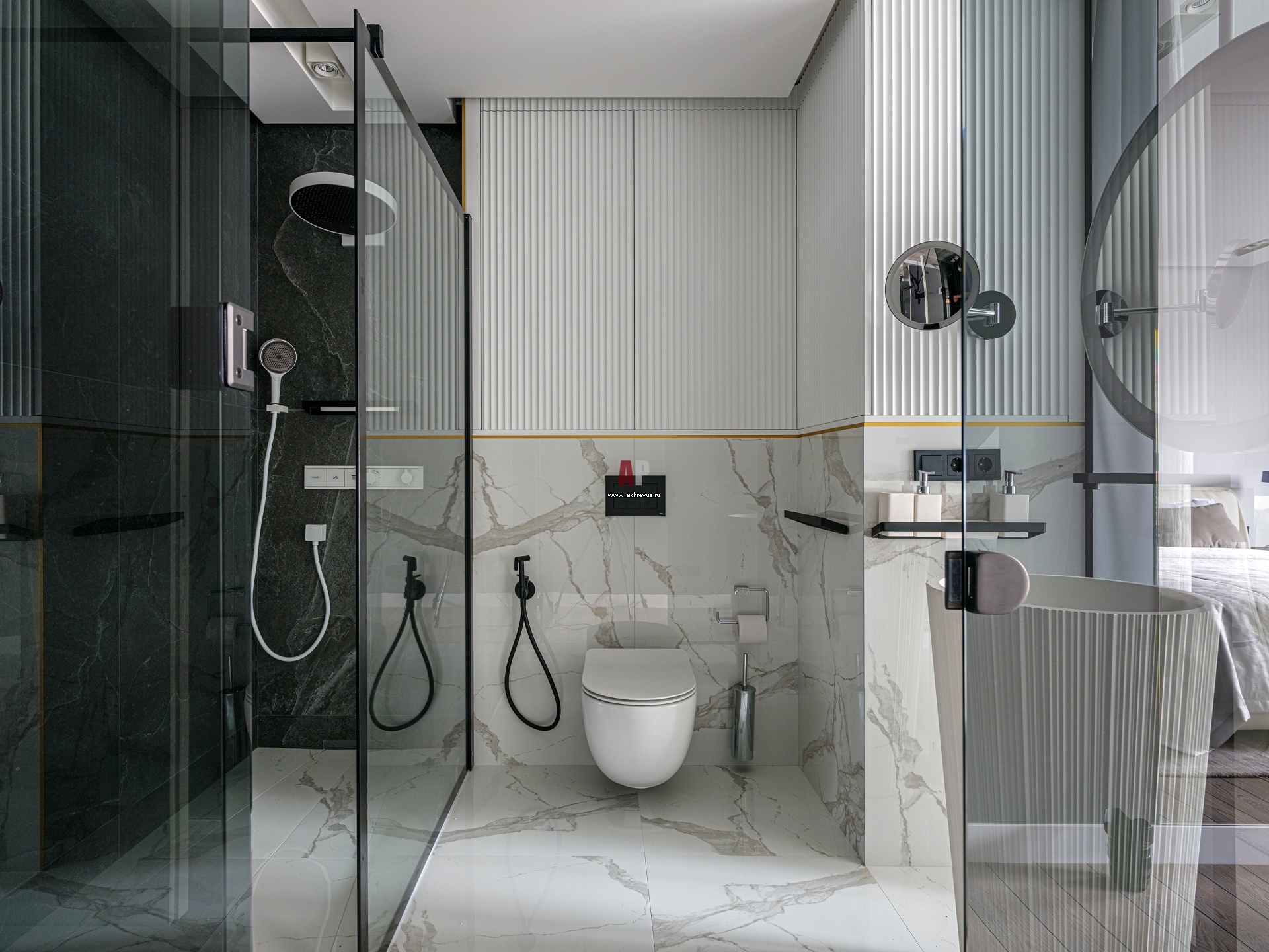 Женский санузел. Стена оформлена гипсовыми 3D-панелями. На полу – плитка с фактурой мрамора. Смесители, Griferias Maier. Унитаз, TOTO.