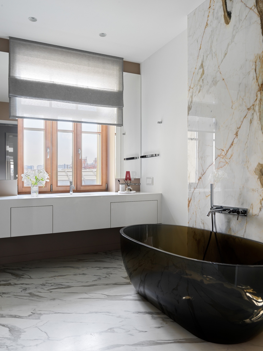 Хозяйская ванная комната. На полу – мрамор Calacatta Borghini. Стены в покраске, за отдельно стоящей ванной – панно из мрамора Calacatta Macchia Vecchia.