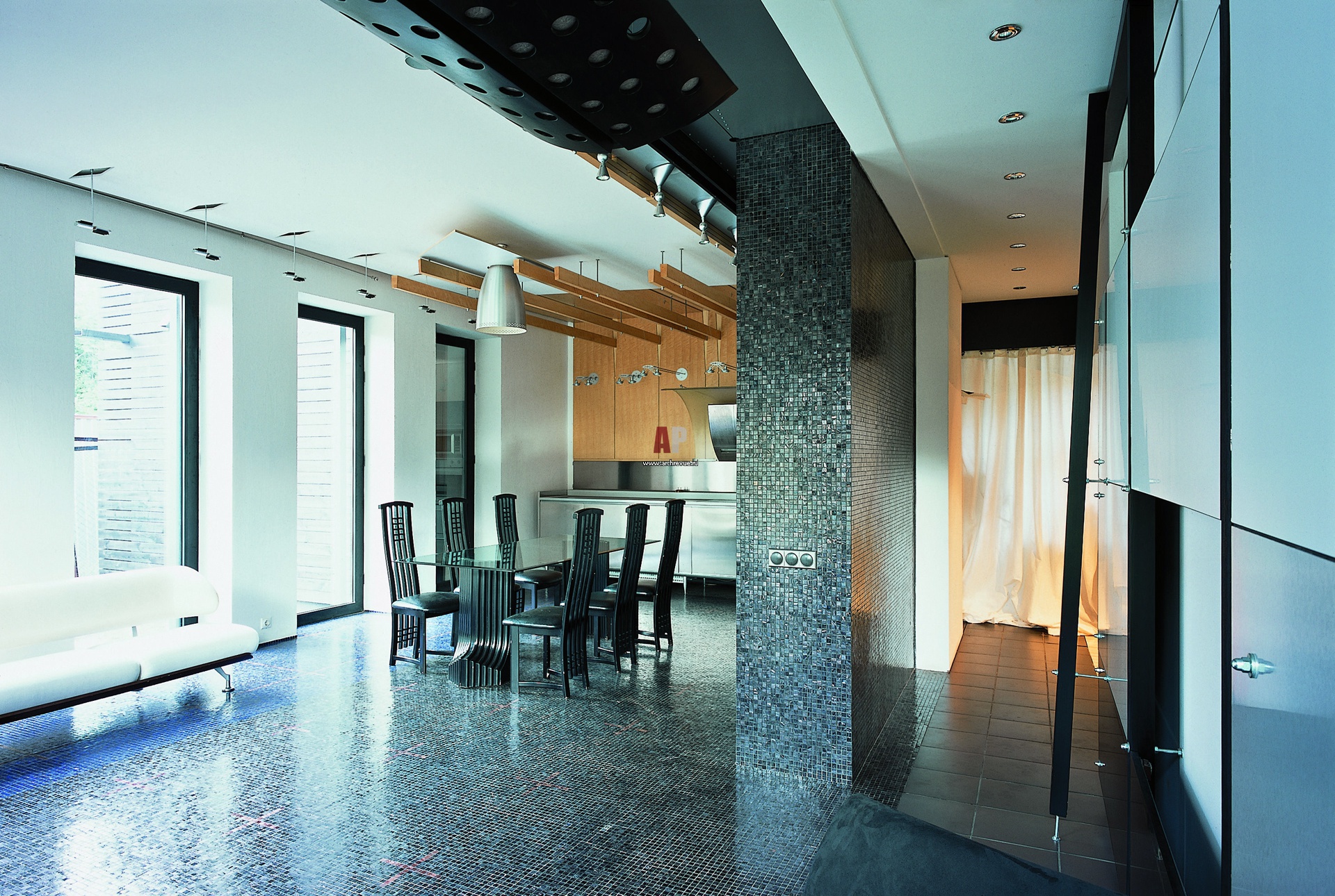 Объединенное пространство кухни, столовой, гостиной. Полы и простенок облицованы мозаикой.
