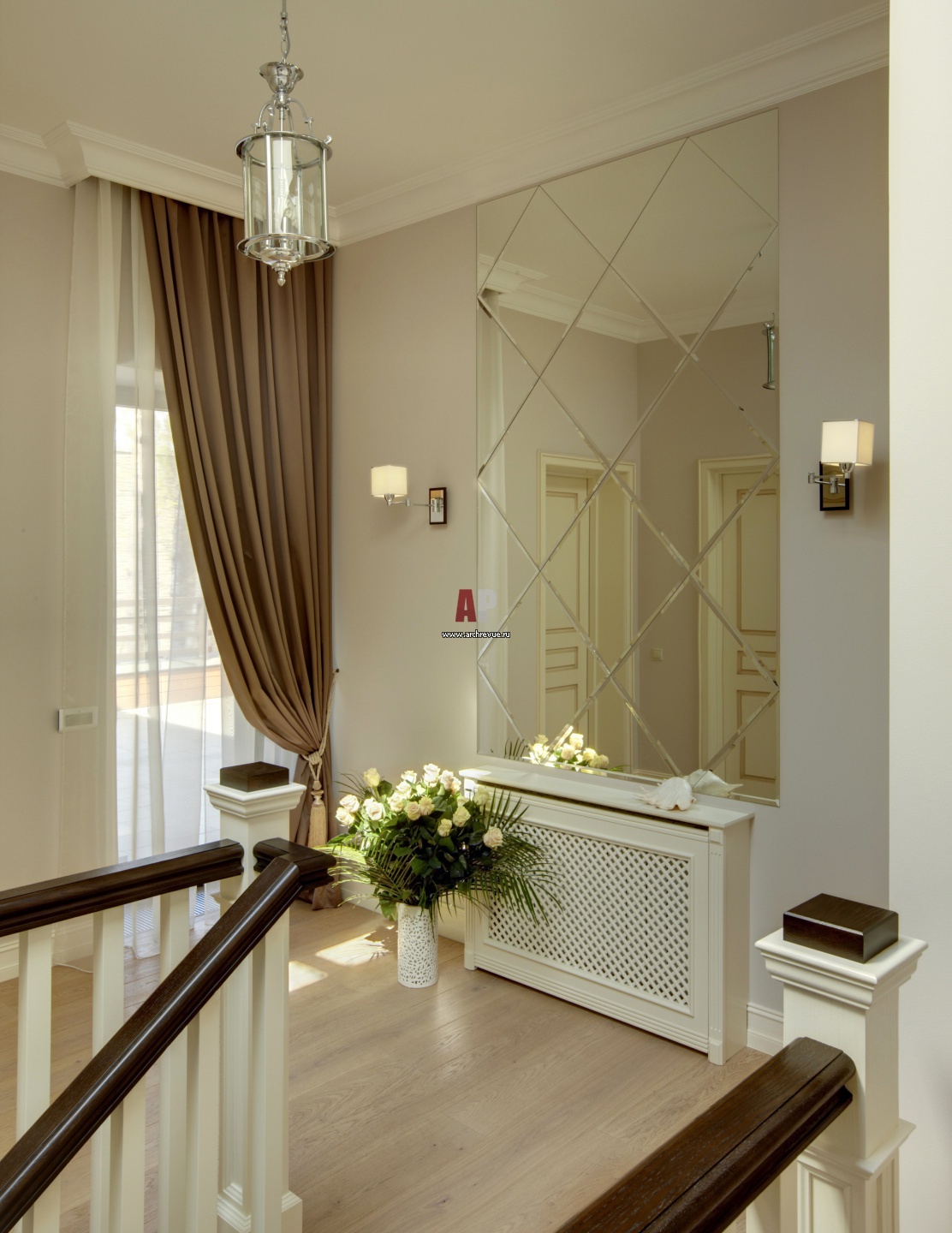 Фото интерьера холла в золотисто-медовой цветовой гамме. Зеркало с фацетами над консолью в духе французской классики.