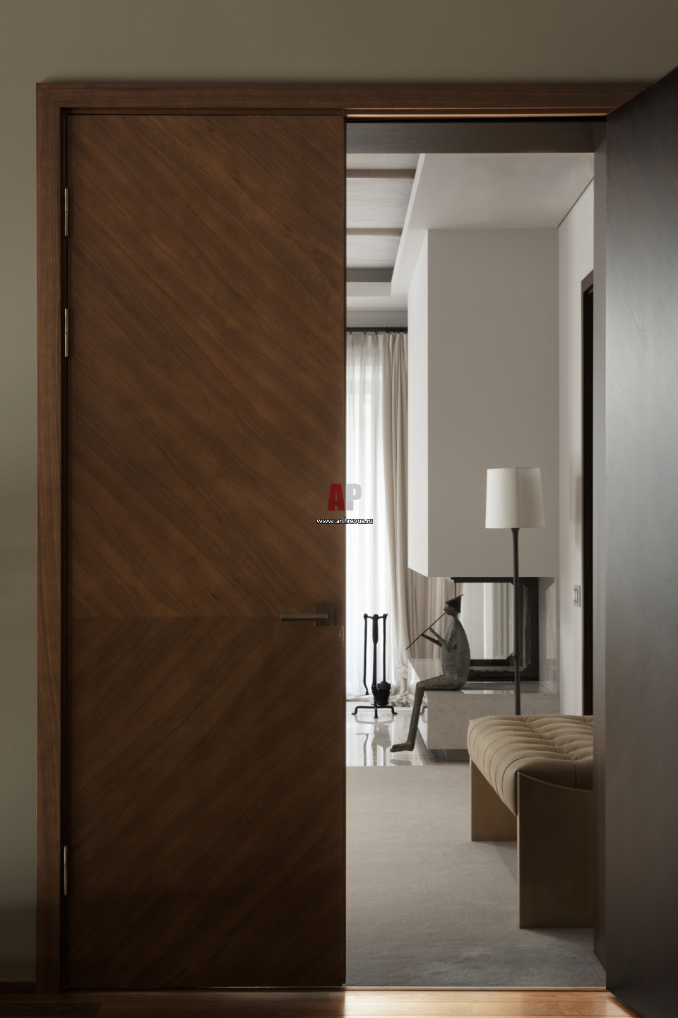 Вид из коридора на хозяйскую спальню. Двери во всем доме выполнены на заказ по эскизам архитектора и изготовлены российскими мастерами. Спальня исполнена в белоснежных тонах.