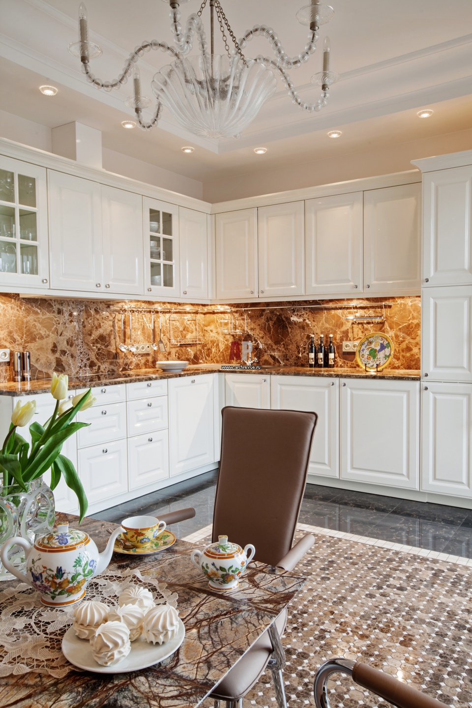 Интерьер кухни в светлой цветовой гамме. Пол выложен мрамором и мозаичным панно из камня. Кухня, Poggenpohl.