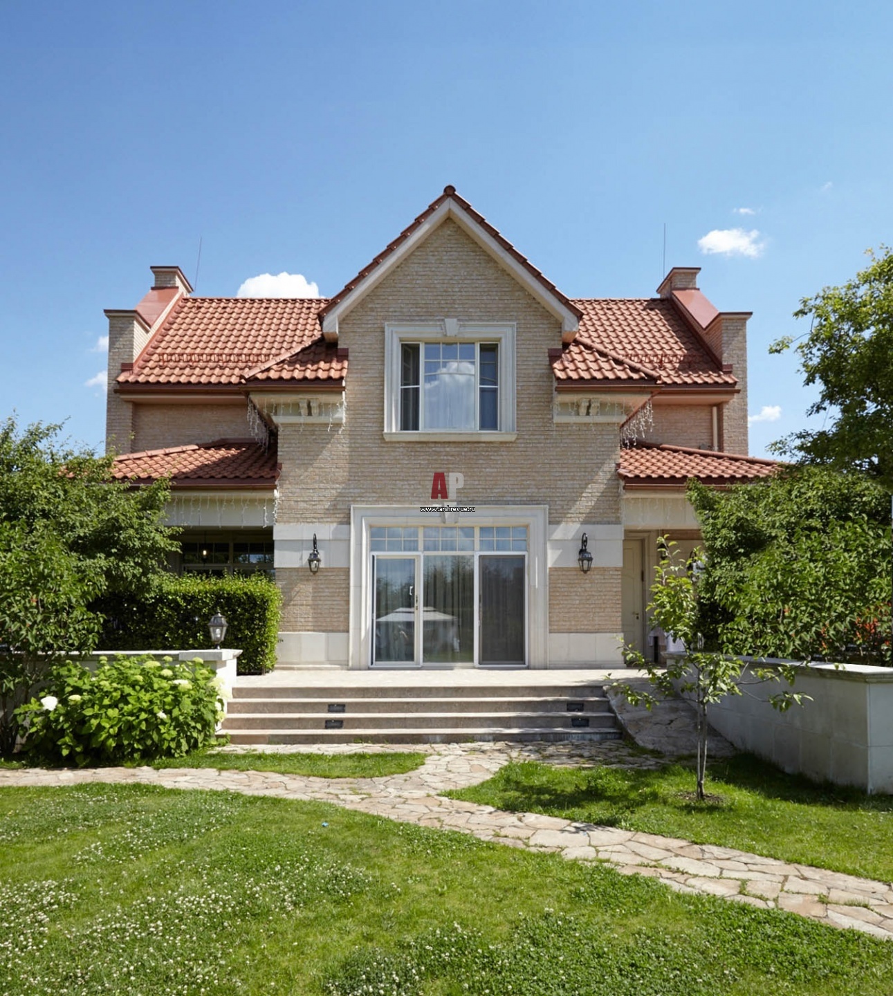 Фасад двухэтажного дома в классических традициях. Ландшафтный дизайн участка, компания