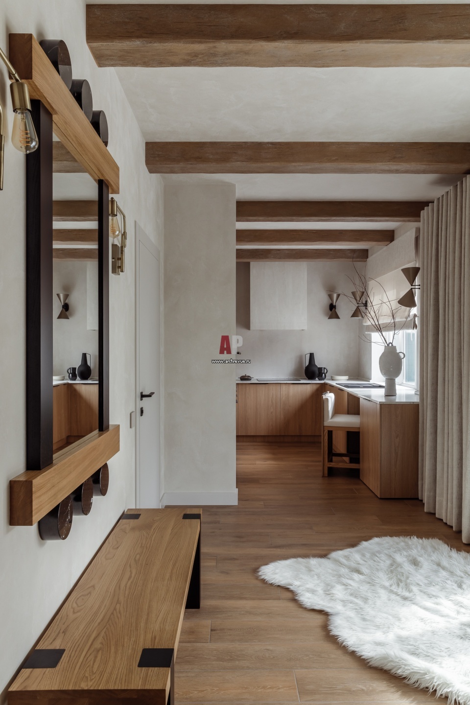 Гостевой дом в стиле современного шале. Вид из прихожей на кухню. На потолке – декоративные балки.