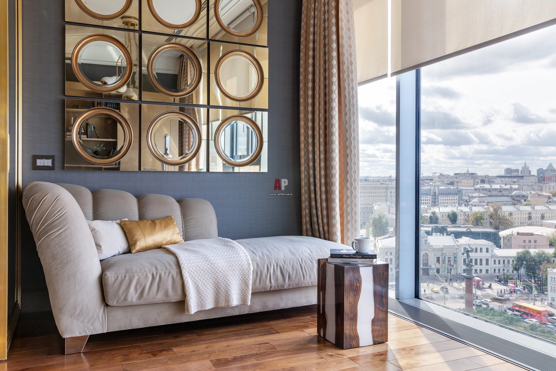 Кабинет. Зона отдыха у окна. Кушетка, Giorgio Collection. Геометрический рисунок зеркала перекликается с оформлением гостиной, орнаментом пола на кухне и декором прихожей.