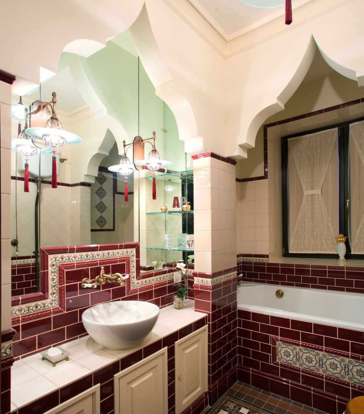 В санузле также присутствуют декоративные арочные конструкции. Помещение оформлено плиткой в восточном стиле, поставщик «Модная плитка».