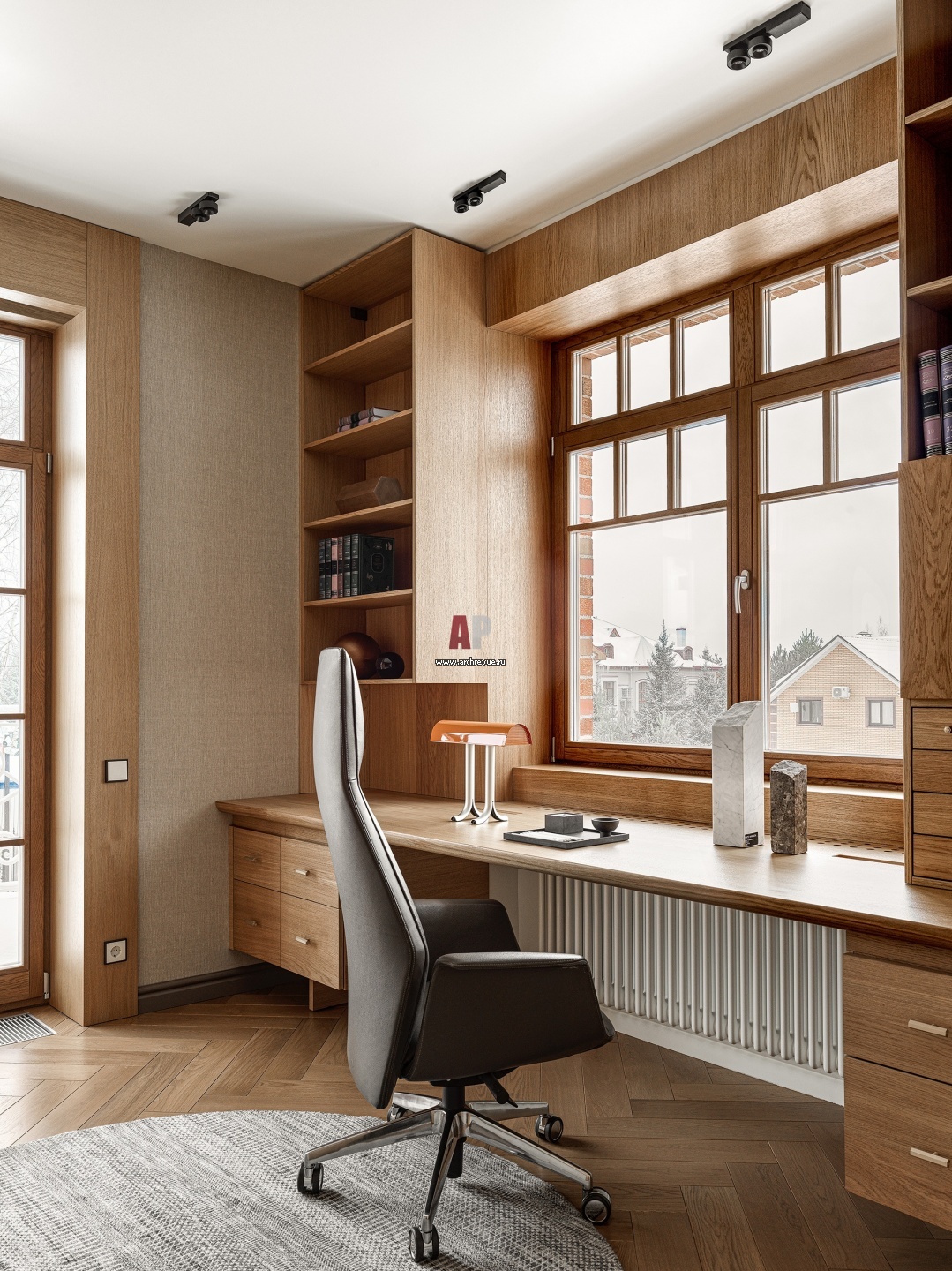 Зона кабинета. Шпонированная мебель изготовлена на заказ.