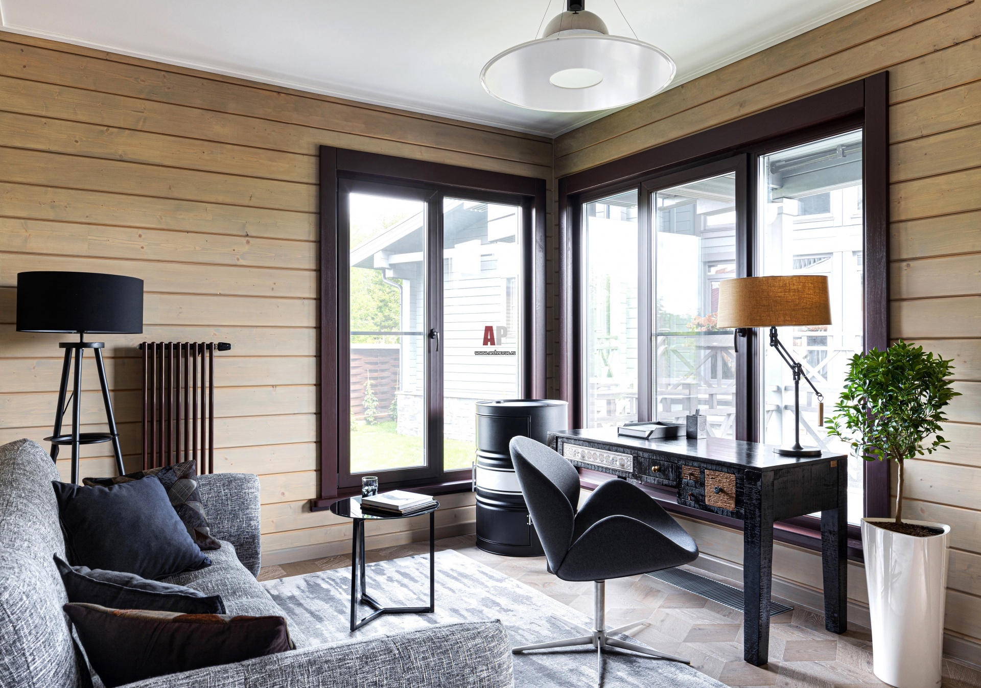 На первом этаже к гостиной примыкает два кабинета – мужской, с угловым окном, и женский. Стены в обоих помещениях делать темными не стали, а выкрасили брус светлыми лессировочными составами. Диван, стол, Kare Design. Кресло, BoConcept. Люстра Flos.
